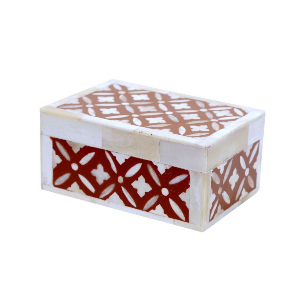 “Caixa Porta Joias Design Arabesco Bege 15x10x7”, construída por artesão indiano com ossos de búfalo nas cores bege e branco, é uma linda peça decorativa e funcional que tem um toque exclusivo de romantismo.