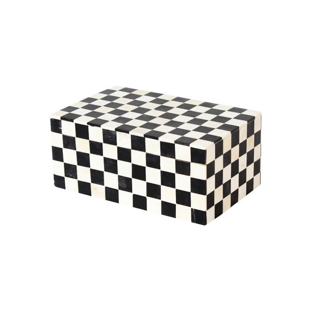 “Caixa Porta Joias em Ossos e Resina 20x13x9”, é uma peça decorativa lindíssima, delicada e com quadrados de ossos e resina, onde o artesão indiano consegue passar toda a bagagem técnica com muita sutileza, charme e tornando a peça única em preto e branco, como um tabuleiro de jogo.