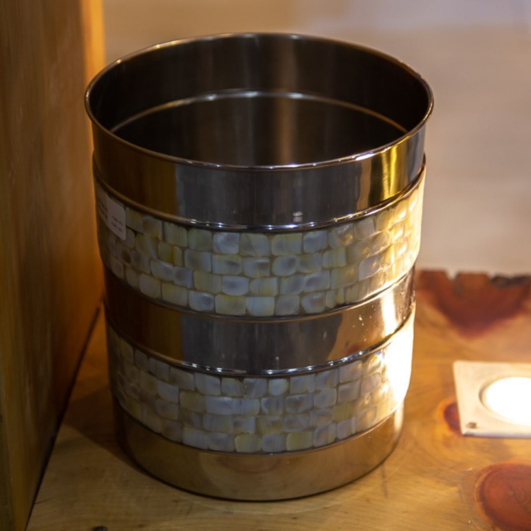 “Cesto de Lixo em Inox com Madrepérola Redondo”, peça de fino acabamento e beleza, excelente para decoração dando aquele toque de sofisticação, elegância e glamour ao ambiente. Com 2 faixas em madrepérola e o acabamento perfeito premiam de elegância e beleza além da resistência e o requinte.
