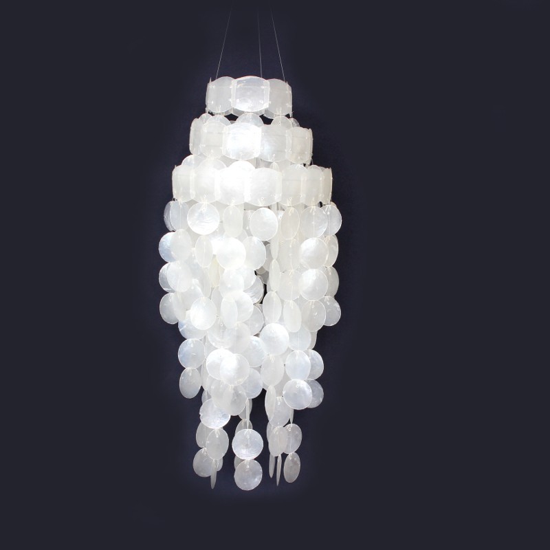 “Chandelier de Madrepérola 20 Natural”, produzido artesanalmente com madrepérolas naturais de alta qualidade no acabamento que agrega imponência, sofisticação e elegância do lustre, sendo perfeito na decoração inconfundível do ambiente.