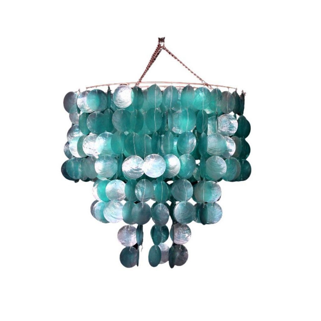 “Chandelier de Madrepérola 45 Turquesa”, produzido artesanalmente com madrepérolas turquesa de alta qualidade no acabamento que agrega imponência, sofisticação e elegância do lustre, sendo perfeito na decoração inconfundível do ambiente.