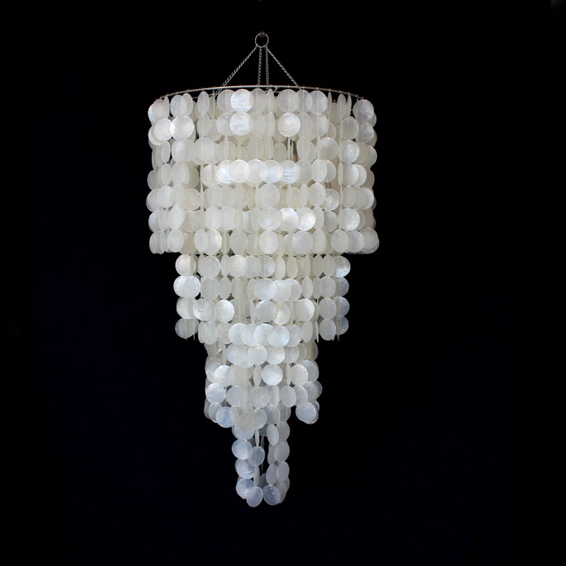 “Chandelier de Madrepérola 50 Natural em Camadas”, produzido artesanalmente com madrepérolas naturais de alta qualidade no acabamento que agrega imponência, sofisticação e elegância do lustre, sendo perfeito na decoração inconfundível do ambiente.