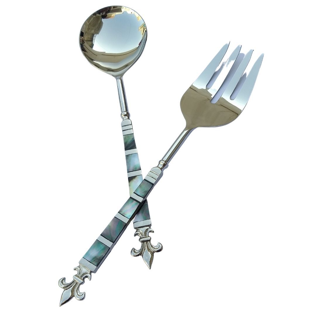 “Conjunto para Salada em Inox e Madrepérola”, importado e com acabamento perfeito, excelente para complementar a decoração do prato de salada, dando aquele ar de sofisticação, elegância e glamour. Conta com o brilho, a elegância e beleza do inox e o cabo retangular com lindo acabamento em madrepérola green shell, onde o artesão com toda sua técnica elabora um design com muita sofisticação no cabo das peças.