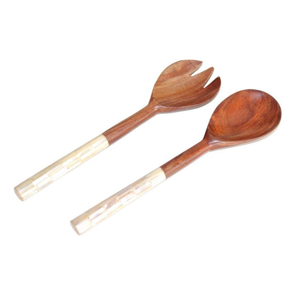 “Conjunto para Salada em Madeira e Osso”, importado e com acabamento perfeito, excelente para complementar a decoração do prato de salada, dando aquele ar de sofisticação, elegância e glamour. Conta com o brilho, a elegância e beleza da madeira e o osso, onde o artesão indiano com toda sua técnica elabora uma peça de muito requinte.