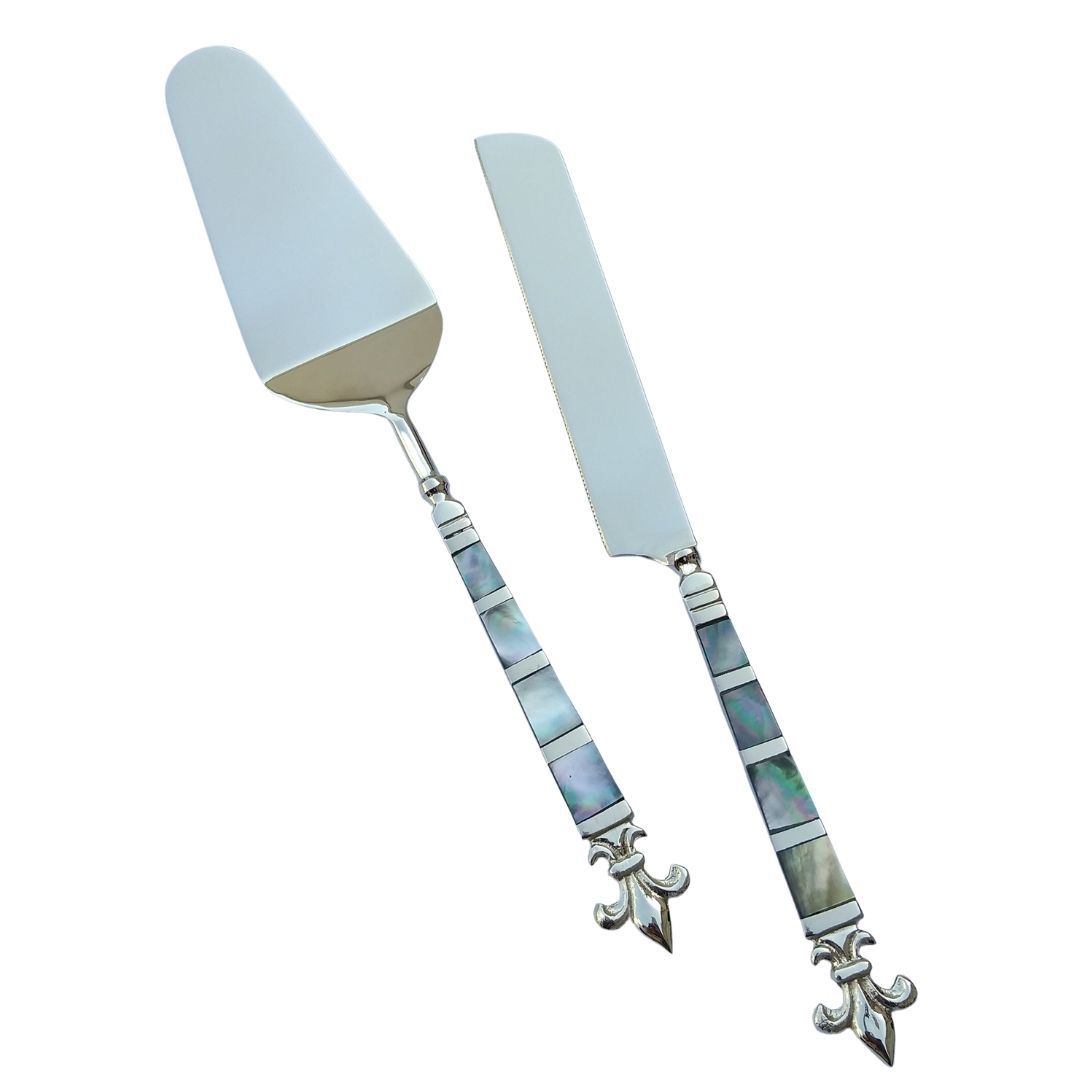 “Kit Espátula e Faca para Bolo em Inox e Madrepérola”, peças fabricadas em inox e cabo retangular em madrepérola green shell, com um toque de exclusividade e delicadeza onde o artesão indiano mostra o requinte e a beleza no acabamento.