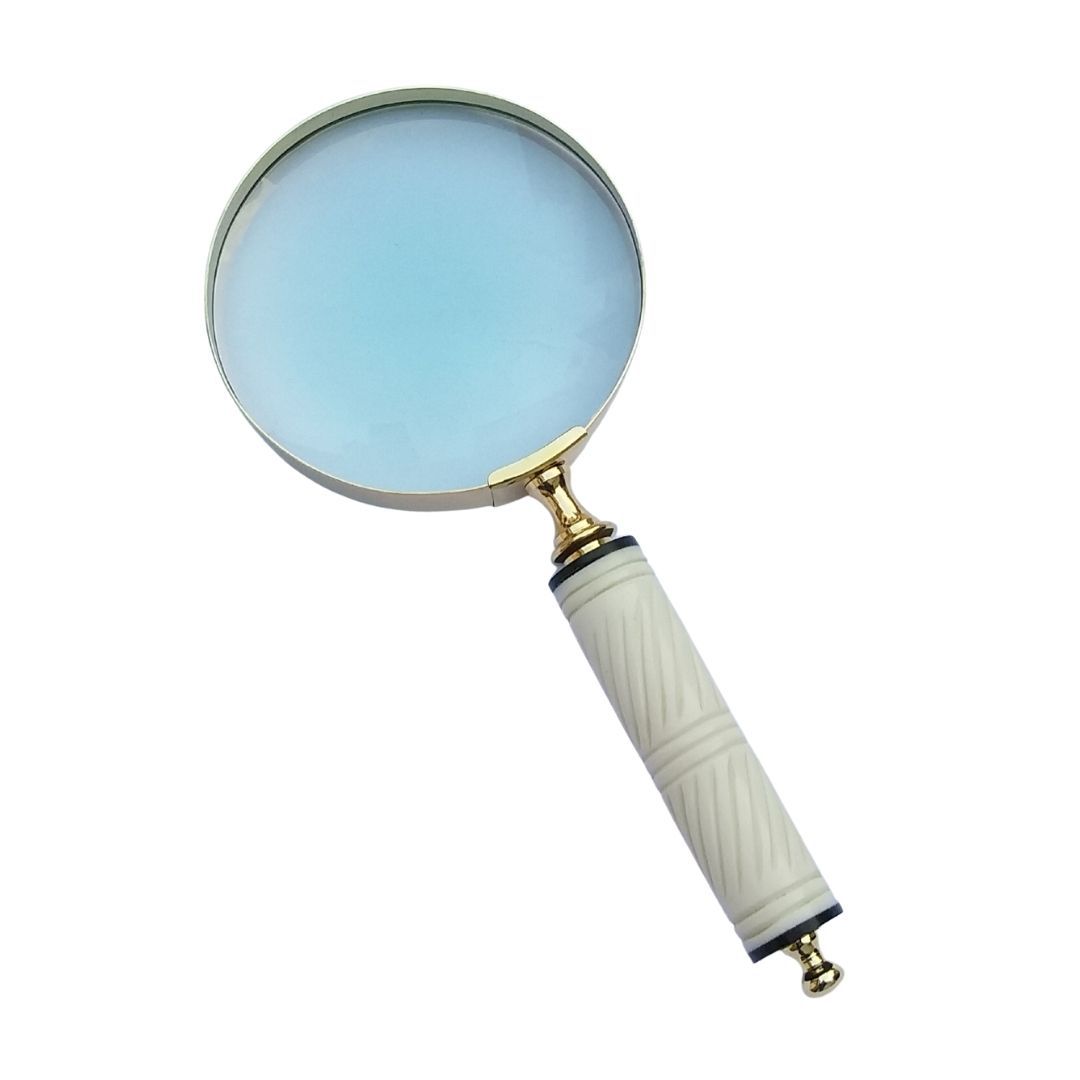 “Lupa de Mão em Bronze e Osso”, peça fabricada em bronze e cabo em osso claro de búfalo com detalhes. Ideal para compor a decoração do ambiente dando um toque de exclusividade, requinte e sofisticação, o seu design único com lente redonda onde o artesão indiano transfere suas habilidades na beleza do acabamento.