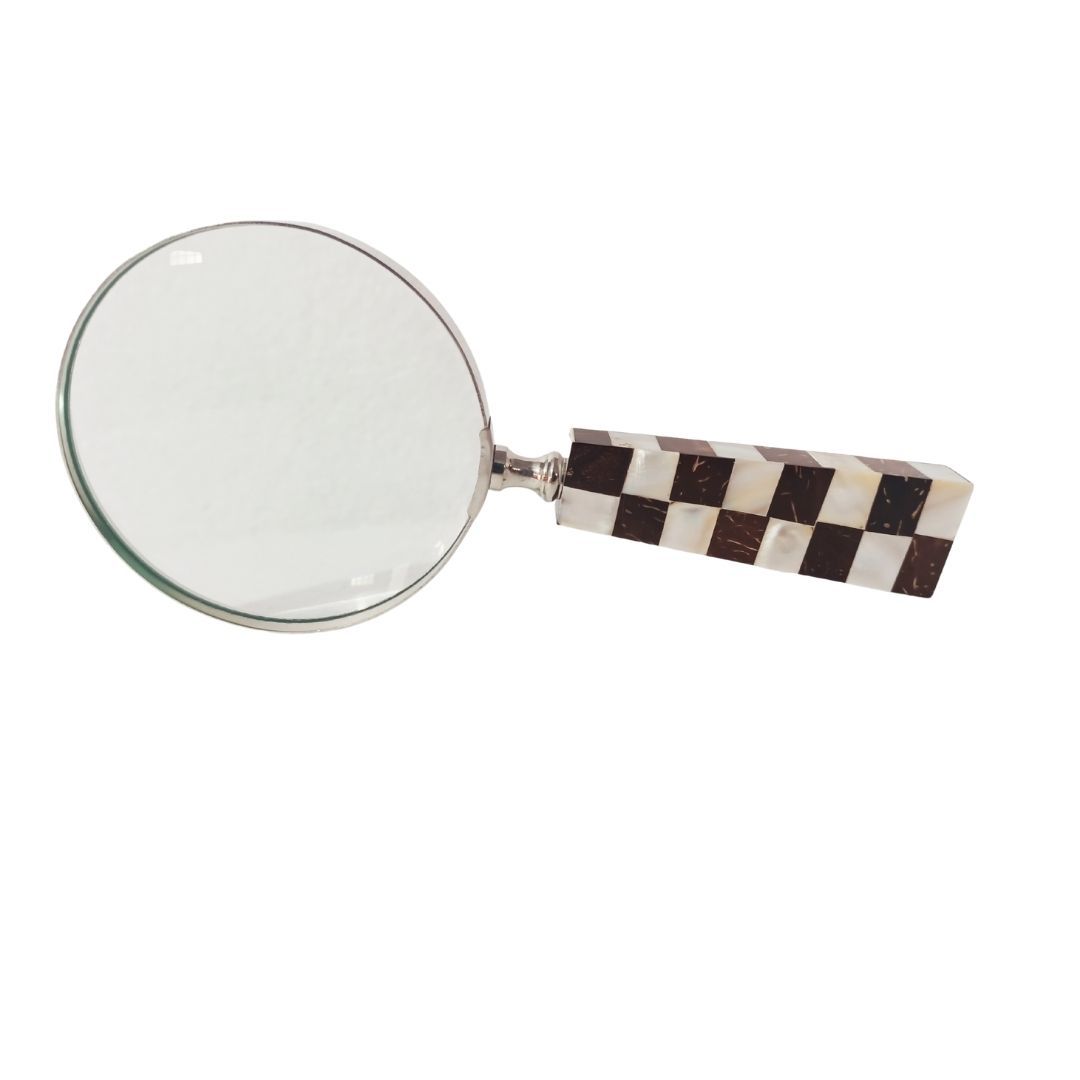 “Lupa de Mão em Inox Coco e Madrepérola”, peça fabricada em inox e cabo em coco e madrepérola. Ideal para compor a decoração do ambiente dando um toque de exclusividade, requinte e sofisticação, o seu design único com lente redonda onde o artesão indiano transfere suas habilidades na beleza do acabamento.