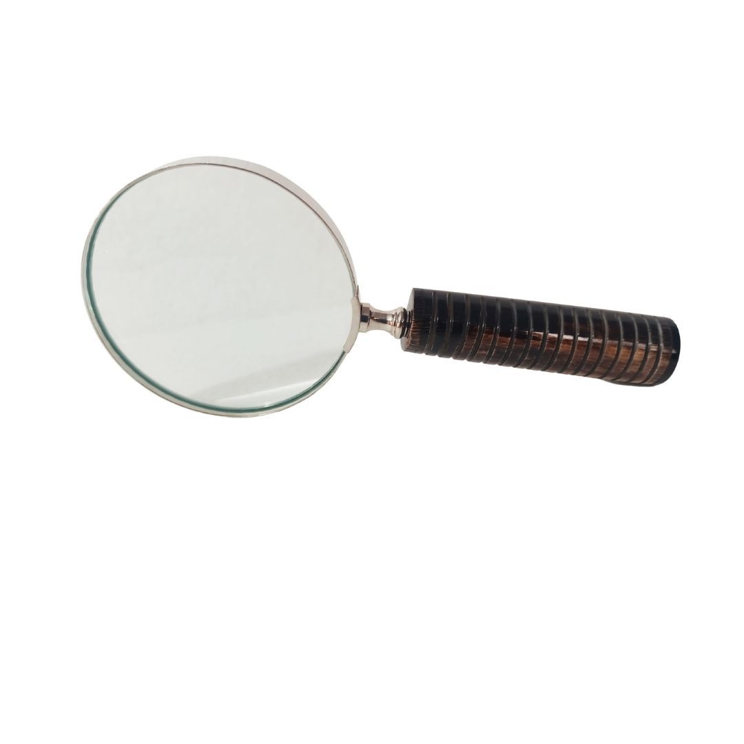 “Lupa de Mão em Inox e Osso”, peça fabricada em inox e cabo em osso escuro entalhado. Ideal para compor a decoração do ambiente dando um toque de exclusividade, requinte e sofisticação, o seu design único com lente redonda onde o artesão indiano transfere suas habilidades na beleza do acabamento.