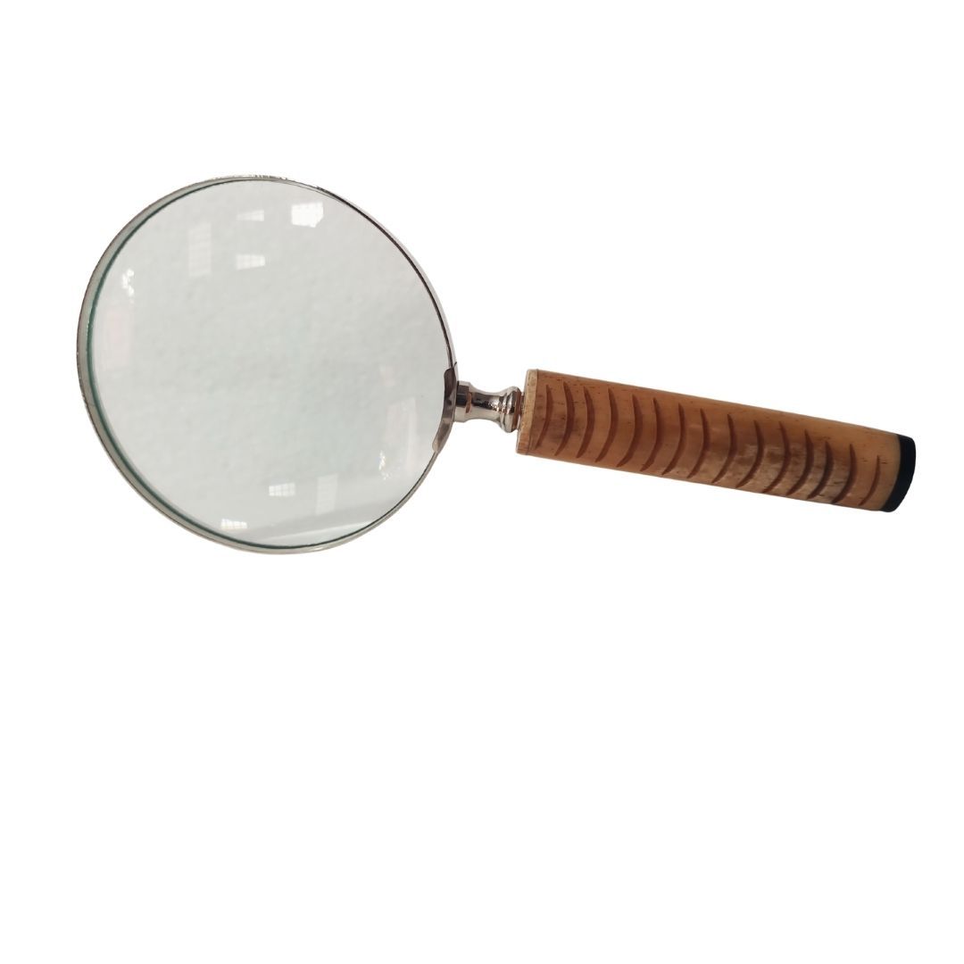 “Lupa de Mão em Inox e Osso”, peça fabricada em inox e cabo em osso marrom e preto entalhado. Ideal para compor a decoração do ambiente dando um toque de exclusividade, requinte e sofisticação, o seu design único com lente redonda onde o artesão indiano transfere suas habilidades na beleza do acabamento.