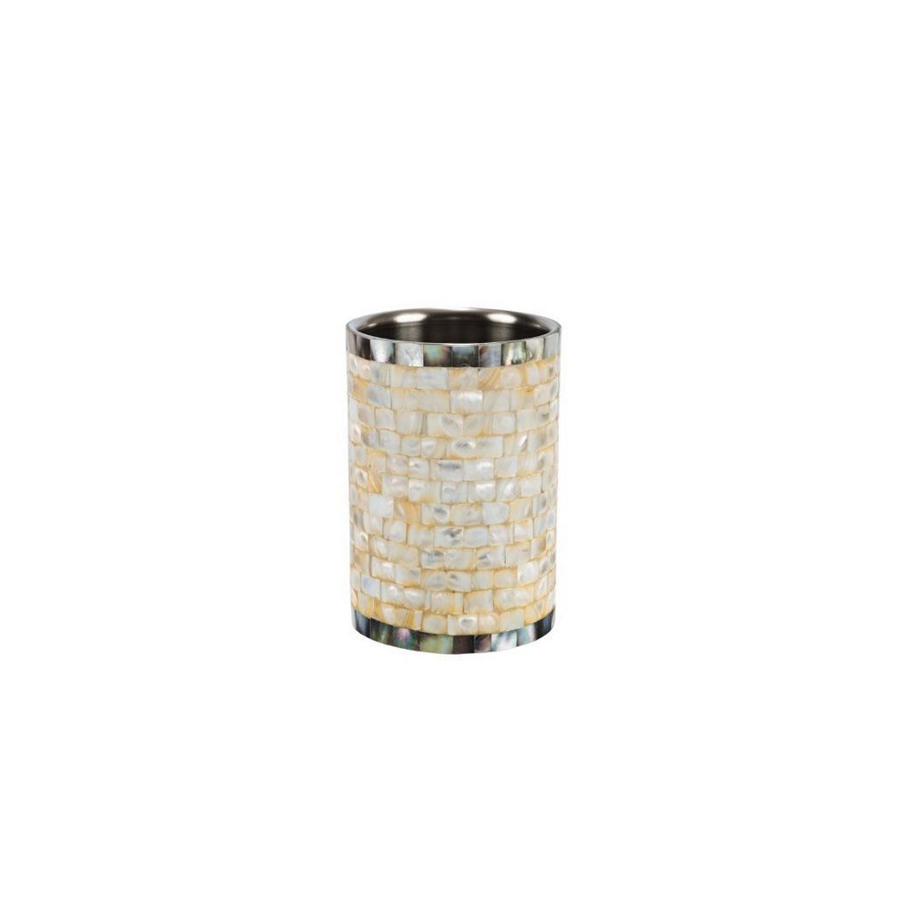 “Porta Garrafa em Inox e Madrepérola”, é uma peça sofisticada, construída em inox com revestida em Madrepérola na parte externa, que exalta o brilho, harmonia e beleza. É possível notar a junção de simetria e brilho na técnica do artesão.