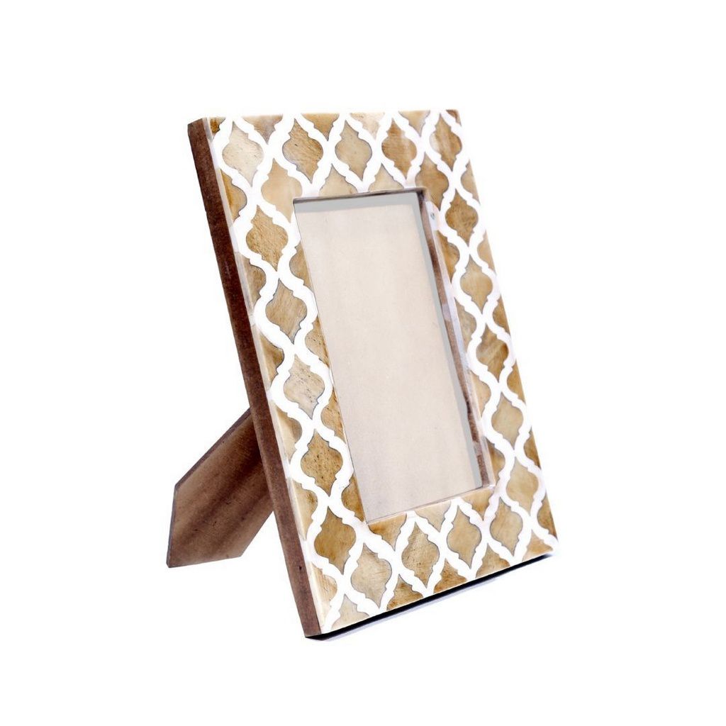 “Porta Retrato em Madeira e Osso”, é um excelente item decorativo, lindo e todo revestido e construído por artesão indiano com ossos de búfalo nas cores bege e branco, design arabesco, que tem um toque de exclusividade, sofisticação, romamtismo e elegância para embelezar o ambiente, emoldurar e valorizar memórias especiais. Adequado para fotos nas dimensões 10x15cm.