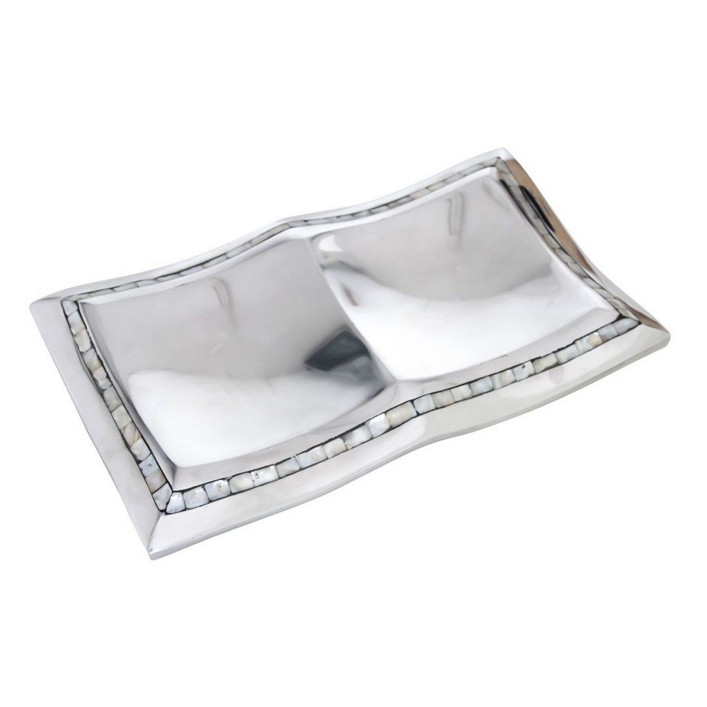 “Travessa Retangular em Alumínio” peça importada toda em alumínio com borda cravejada em madrepérola natural com separação. Compõe perfeitamente e elegantemente com a sofisticação e beleza do ambiente, pois traz a resistência do alumínio com a sutileza da madrepérola.